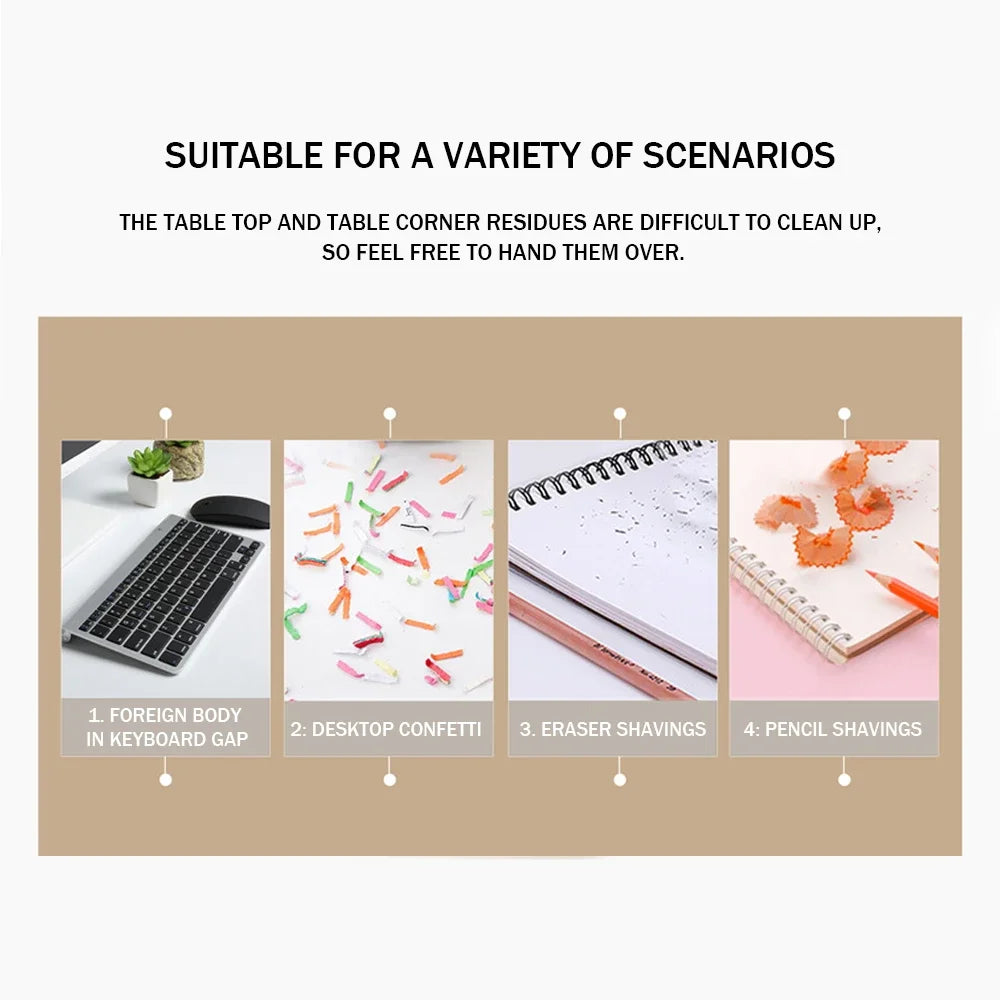 1.Large suction force, can easily absorb dust, paper scraps, eraser scraps, hair, melon seed rind and other common desktop garbage.